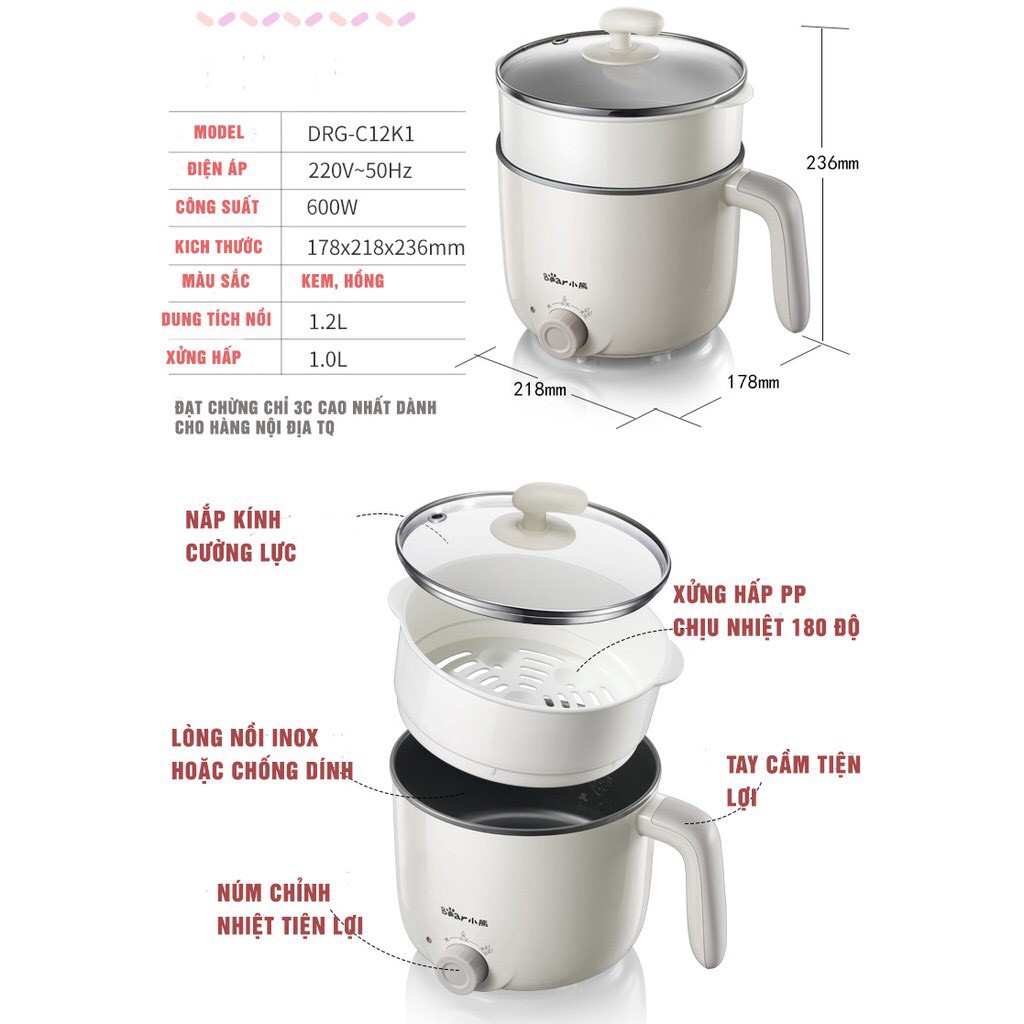 Giới thiệu [ BH 12 Tháng] Nồi Điện Đa Năng Hầm Cháo, Nấu Mỳ , Nồi Lẩu Mini Đa Năng BEAR DRG-C12K1 , Tự Ngắt Khi Đủ Nhiệt