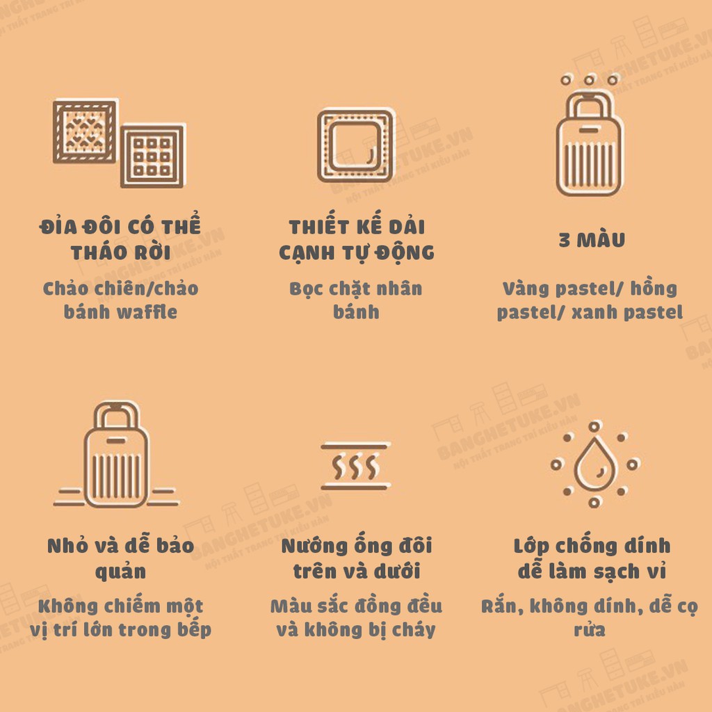 • Chức năng: máy nướng bánh mì Sandwich, làm bánh Waffle, rán trứng,..