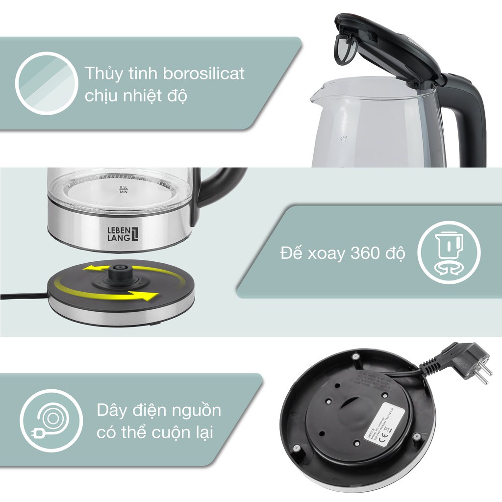 Giới thiệu [Mã ELHADEV giảm 4% đơn 300K] [BH 2 năm] Ấm siêu tốc bình siêu tốc thủy tinh của Đức LEBENLANG LBE2819 1.8L
