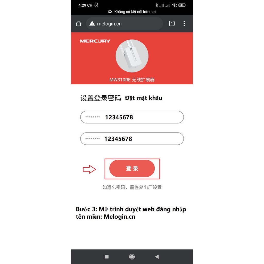Bước 2: Vào trình duyệt vào trang ” melogin.cn ” hoặc dải IP 192.168.1.253 rồi nhập mật khẩu gồm 8 – 15 ký tự (12345678) ( lưu ý: Phần trên và phần dưới giống nhau)
