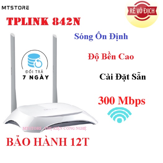 - Bộ Phát Wifi TPLink 842N do hãng TPLink sản xuất kế tiếp thế hệ thành công tiếp theo của dòng TPLink 841N. Kế thừa những đặc tính chuẩn N, kèm theo đó là thiết kế bắt mắt hơn đồng thời được cải tiến hơn về hiệu năng sử dụng với chuẩn tốc độ 300Mbps, khả năng phát sóng xuyên tường và xa hơn.
