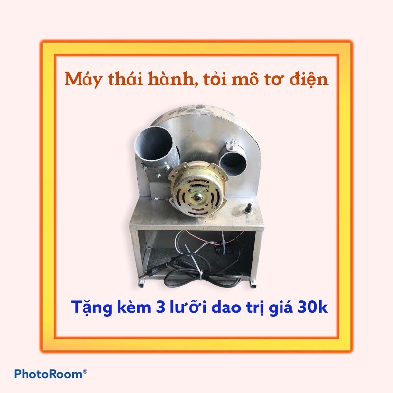 MÁY THÁI HÀNH TỎI CHẠY BẰNG MÔ TƠ ĐIỆN 220VMáy Thái Hành,Tỏi Dùng Điện là phiên bản nâng cấp của máy thái hành,tỏi quay tay. Thay vì dùng tay quay thì bây giờ chỉ cần cắm điện bật công tắc cho hành vào là thái, rất đơn giản và tiện dụng, giúp tiết kiệm chi phí nhân công, tăng cao hiệu suất lao động, giảm tối đa khả năng cay mắt và mùi.