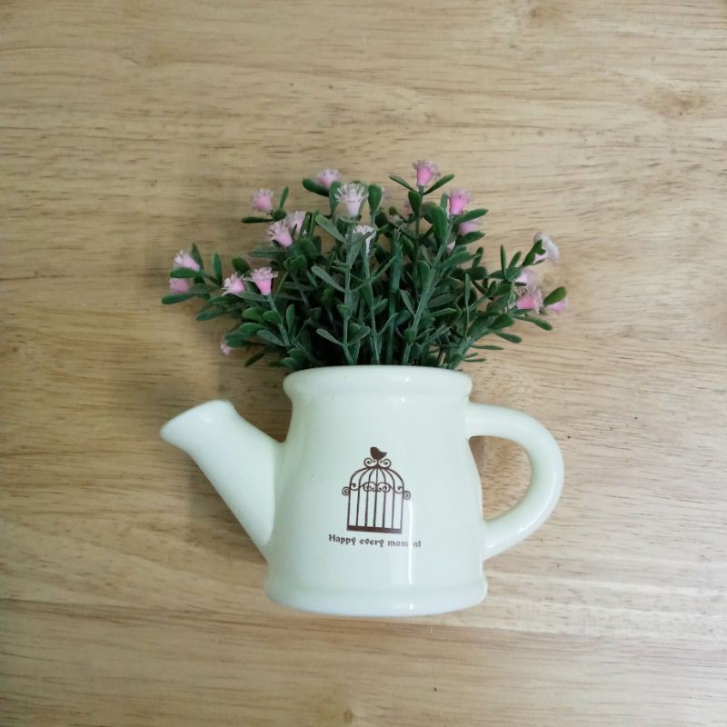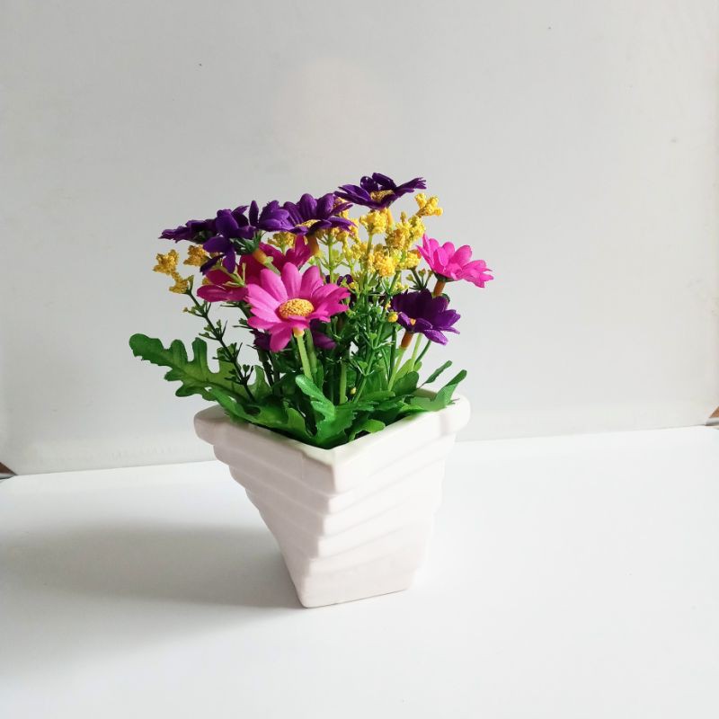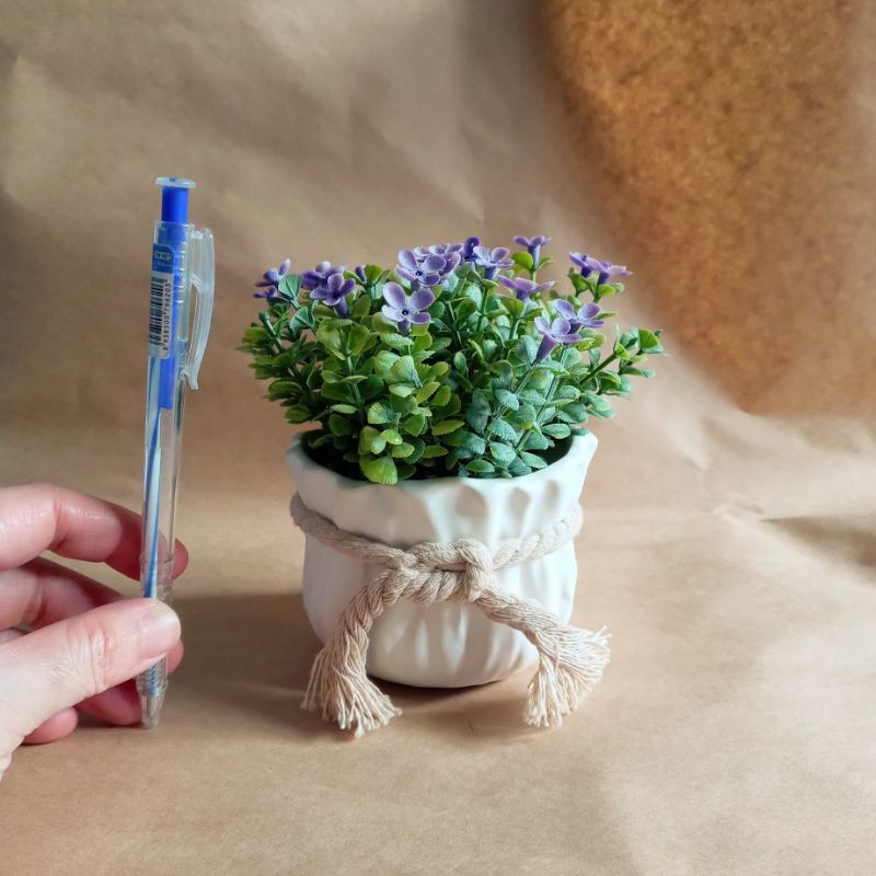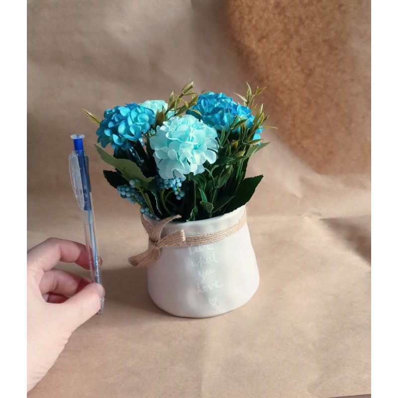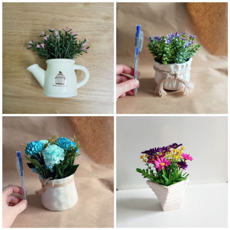 Bình sứ kèm hoa với nhiều loại hoa nhỏ xinh dùng bày bàn trà, kệ trang trí, bàn làm việc...Kích thước: chiều cao cả bình sứ và hoa tùy mẫu là 12-16cm.