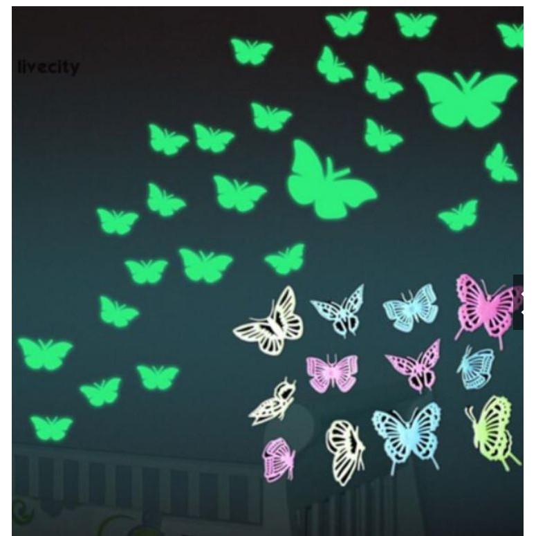 Hướng dẫn sử dụng : trước khi đem dán bạn nên đem phơi sáng từ 30 phút tới 2h đồng hồ. Được hấp thụ ánh sáng, những con bướm sẽ phát sáng lung linh mờ ảo trong đêm tối. Vô cùng đẹp mắt và thú vị.- sản phẩm gồm : 12 bướm có kích thước màu sắc , hình dáng khác nhau.