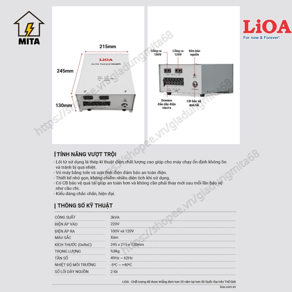 Giới thiệu Biến áp đổi nguồn LiOA 3000VA, biến áp đổi nguồn hạ áp LIOA (điện vào 220V - điện ra 100V/120V) DN030 - MITA