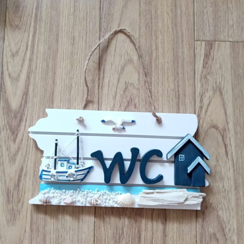 Biển treo cửa WC hình nổi 3D chủ đề biển với hình thuyền và cánh chim hải âu.Chất liệu: khung gỗ MDF, hình trang trí bằng gỗ, có đá, vỏ ốc...