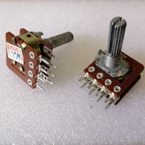 Biến trở kép WH148 trị số 50K, 100K 8 chân 2 hàng, xoay có khấc (bước nhảy) tạo điểm dừng. Tham khảo sơ đồ chân để biết cách đấu nối.Thường dùng trong các bộ điều chỉnh âm lượng.