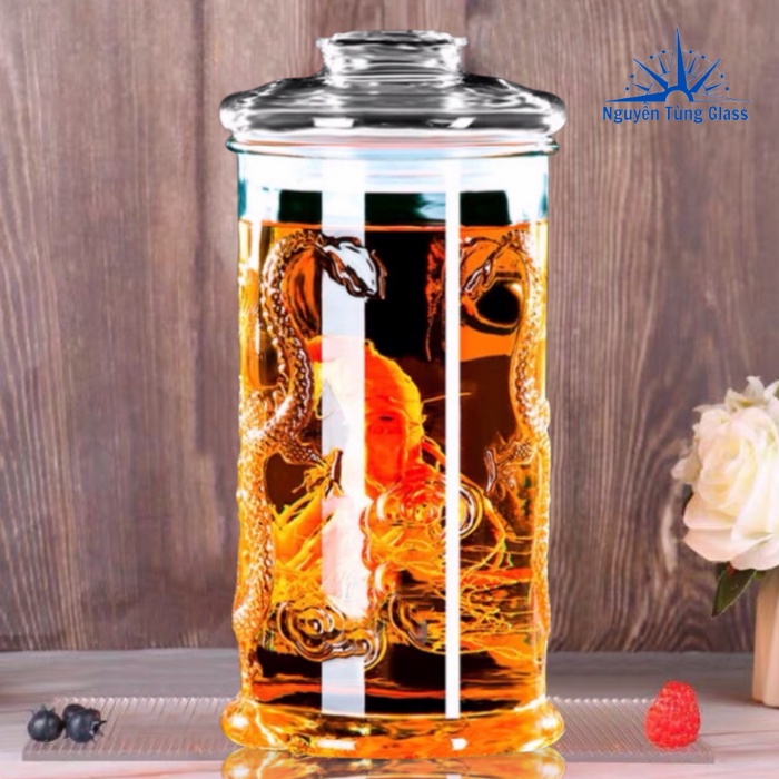Bình được làm từ thủy tinh nguyên chất, có độ dày, trong suốt và sáng bóng cao, thích hợp để ngâm rượu, ủ lên mêm các loại hoa quả, thuốc bắc… Thích gì đựng nấy hoặc dùng để trang trí nội thất cho tư gia quán ăn, nhà hàng.Với thiết kế hoa văn hình con rồng mang đậm nét truyền thống, tạo cho người dùng cảm giác cao quý sang trọng, góp phần tạo nên vẻ đẹp cho ngôi nhà của bạn.