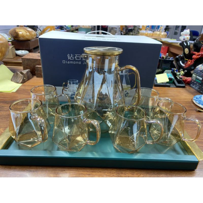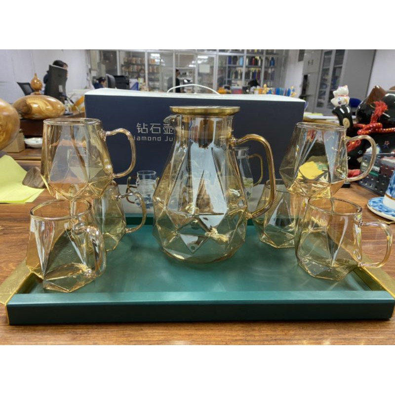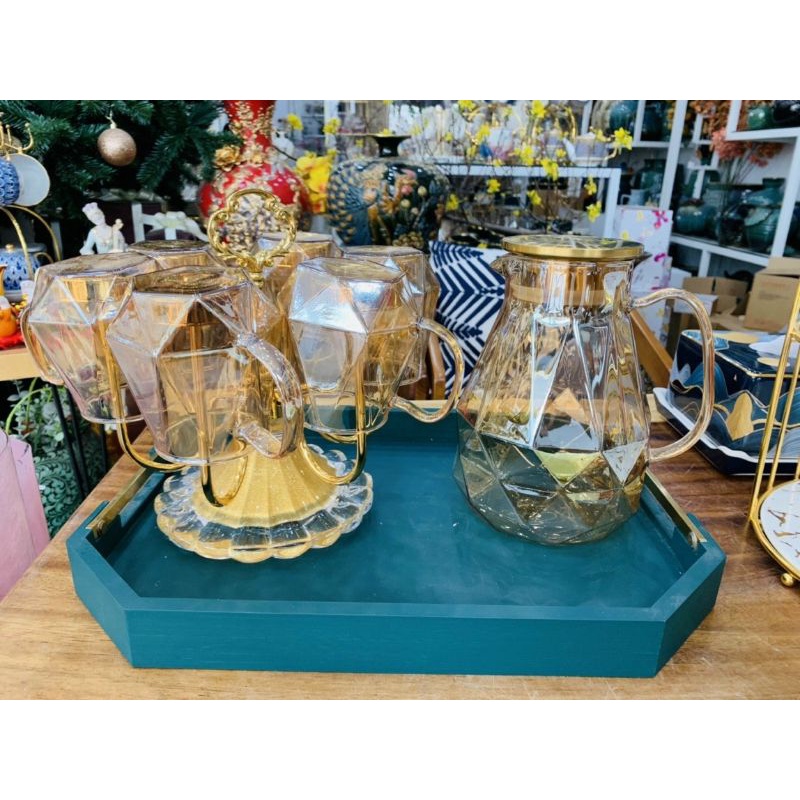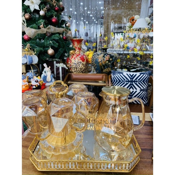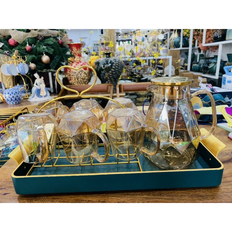 Nhà cửa & Đời sống > Bộ đồ bàn ăn > Bình nước & phụ kiện || Bộ Bình 6 Ly Thủy Tinh Chịu Nhiệt Ánh Vàng, Bộ bình nước thủy tinh 1800mlCòn hàng