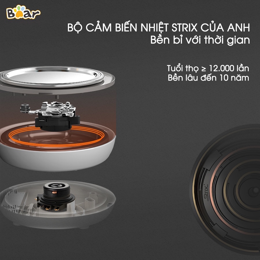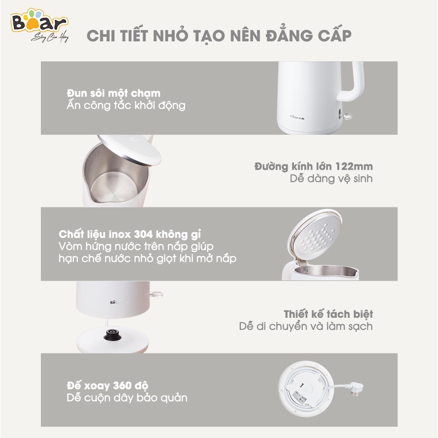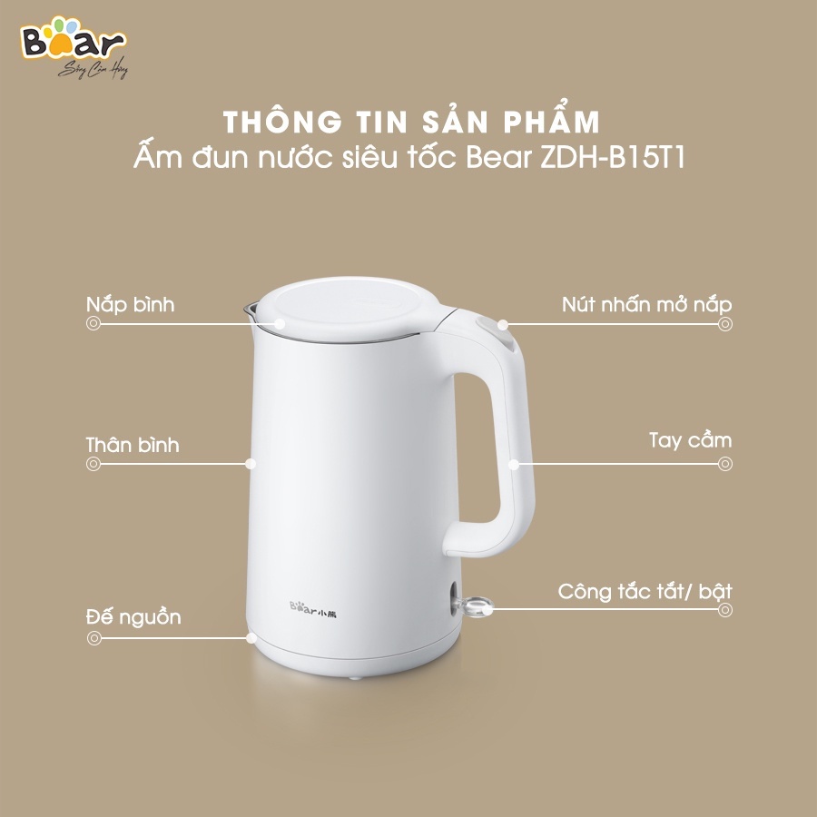 Được tích hợp động cơ cảm biến nhiệt Strix của Anh, ấm siêu tốc Bear có tuổi thọ dài gấp 12.000 lần so với các loại ấm siêu tốc thông thường và khả năng vận hành bền bỉ lên tới 10 năm. Với động cơ cảm biến nhiệt thông minh, kết hợp cùng công suất 1500W, ấm siêu tốc Bear sẽ làm nóng nước nhanh chóng, tự ngắt điện khi nước sôi và tự kích hoạt chế độ bảo vệ khi quá nhiệt.Ấm đun nước siêu tốc Bear ZDH-B15T1 có dung tích 1.5L, rót được 6 cốc 250ml mỗi lần đun sôi. Dung tích này có thể đáp ứng đủ nhu cầu nước nóng hàng ngày cho 2-4 người, giúp bạn có nước nóng để uống bất cứ lúc nào chỉ trong một vài phút. Với ấm siêu tốc Bear, bạn có thể pha được nhiều thức uống khác nhau như: pha trà, pha sữa, pha cà phê,...