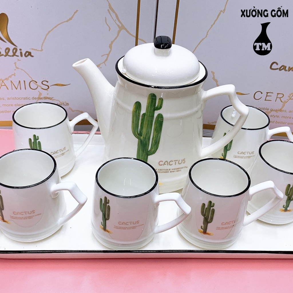 Bộ Bình Ca Đựng Nước Khay Sứ Pha Trà Xưởng Gốm TM Bát Tràng Họa Tiết Cây Xương Rồng