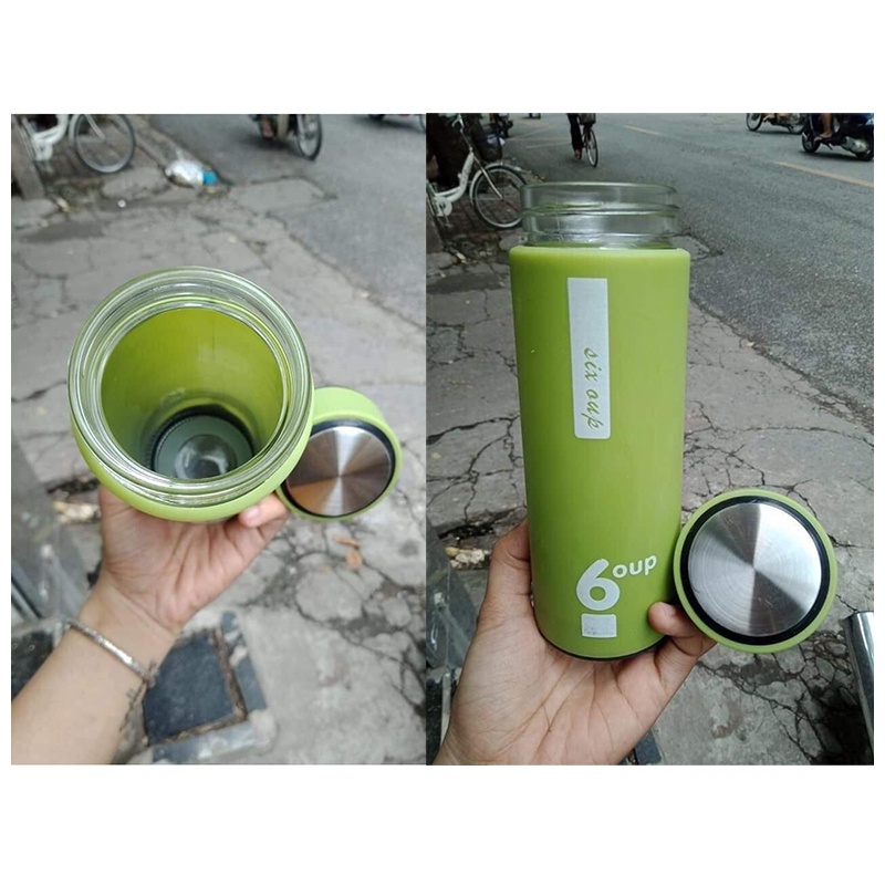 Bình chai đựng nước thủy tinh 6OUP 450ml có vỏ bọc nhựa nhiều màu- Ruột bình được làm bằng thủy tinh cao cấp, trong suốt, chịu nhiệt từ 0 đến 70 độ C.