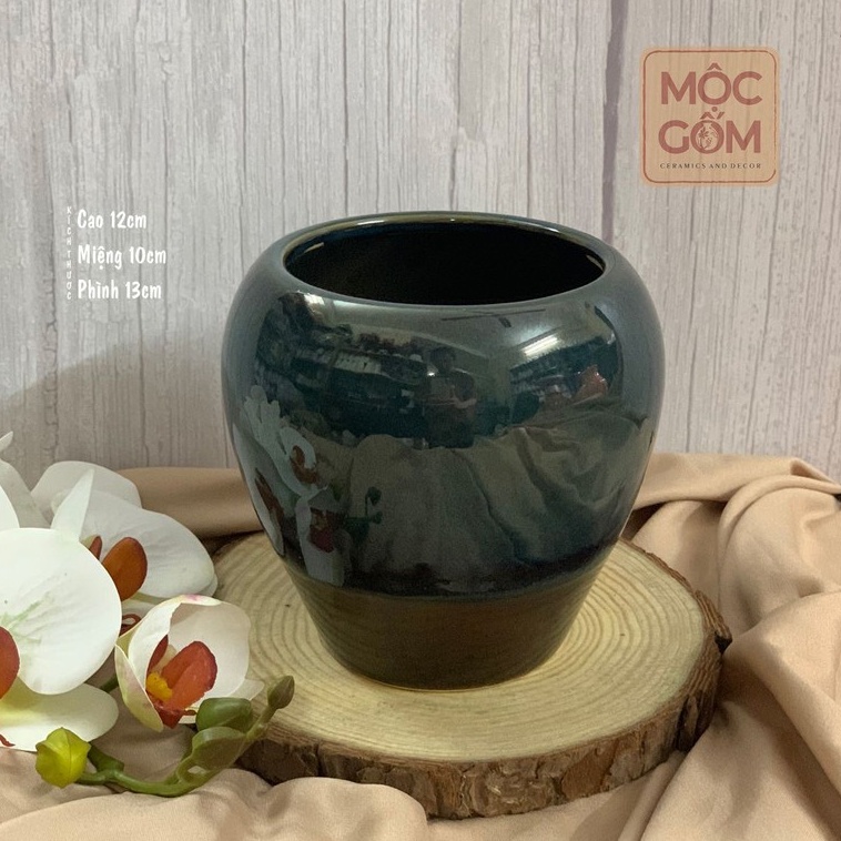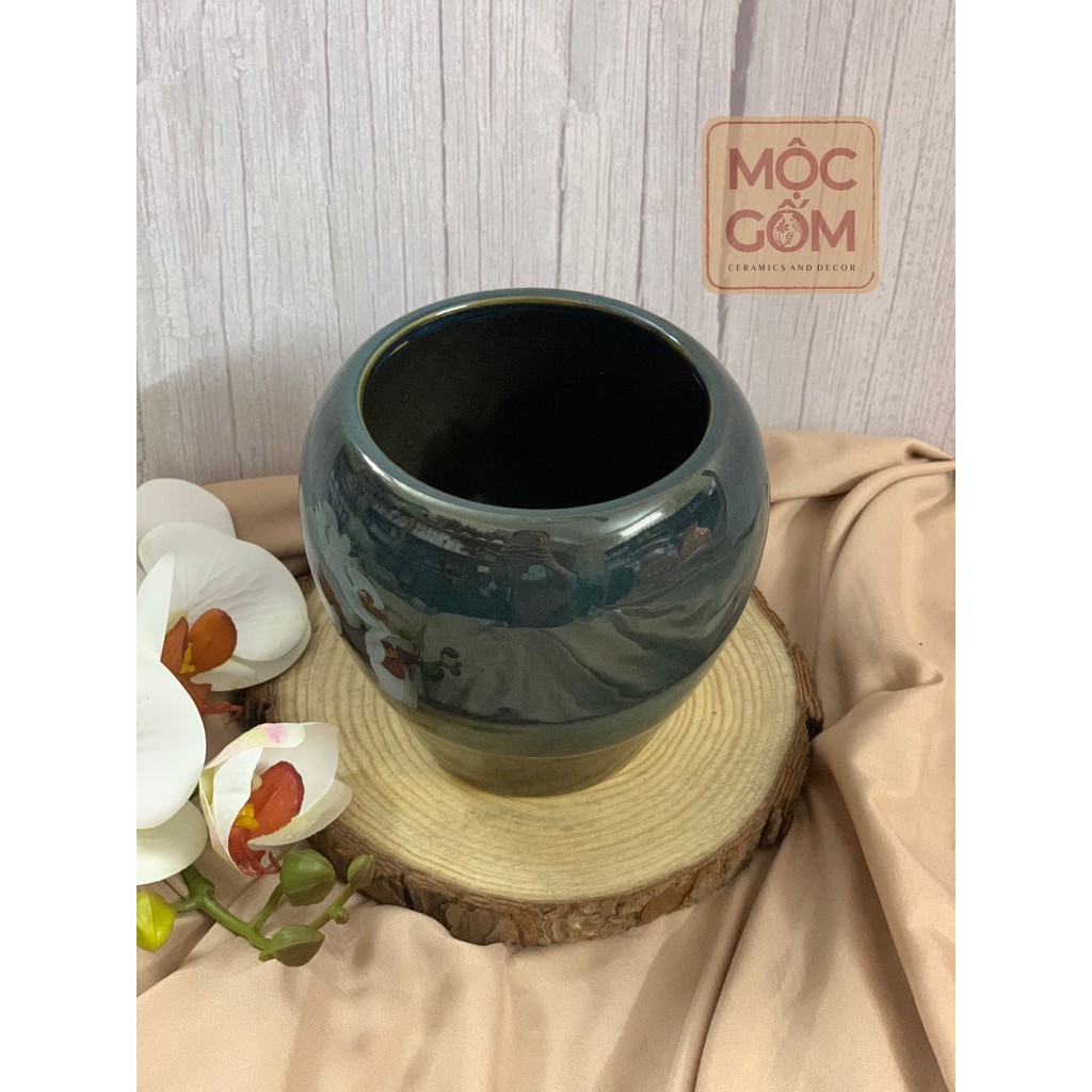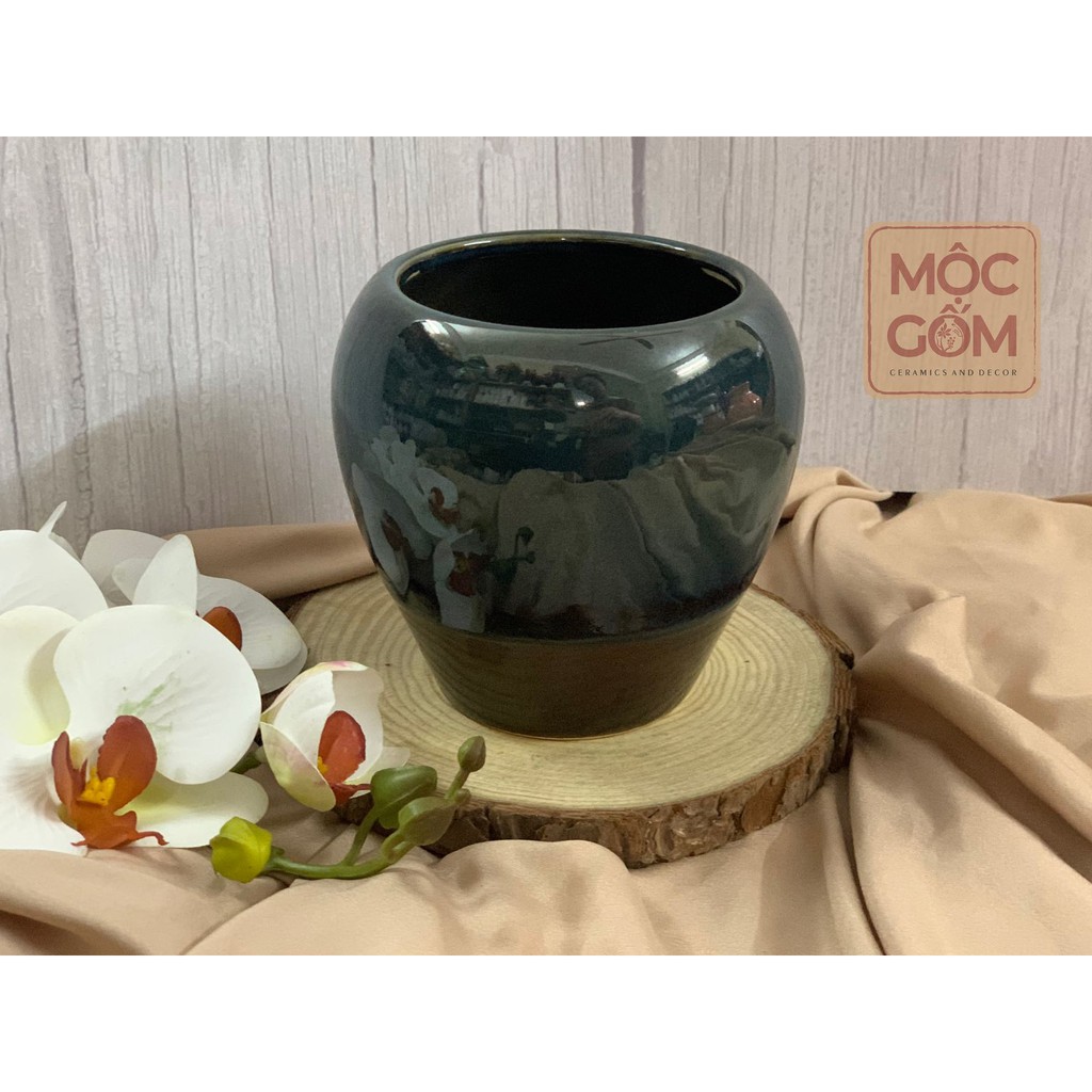 Bình chum gốm nhỏ trồng cây đáy có lỗ men xanh hỏa biến Bát Tràng trang trí phòng khách đẹp - Mộc Gốm