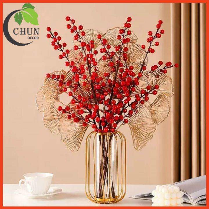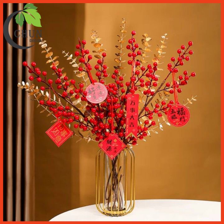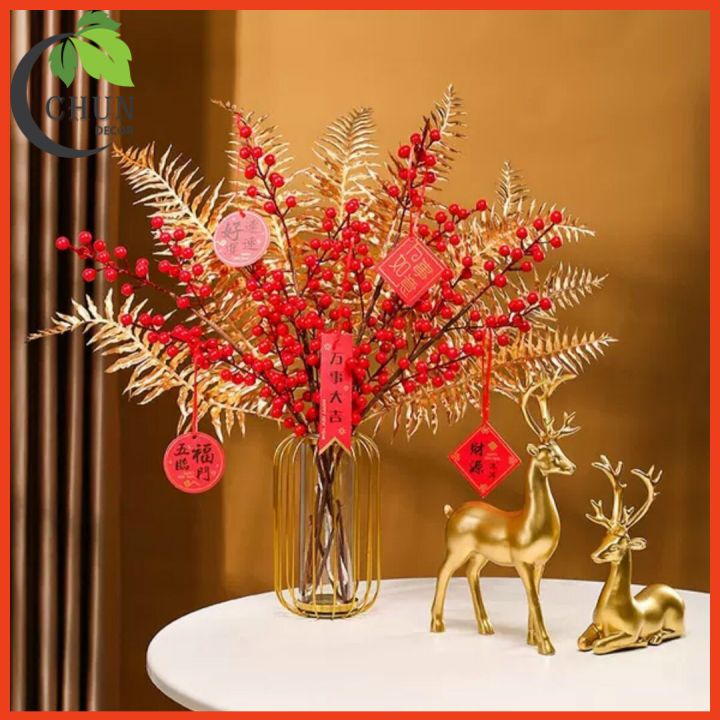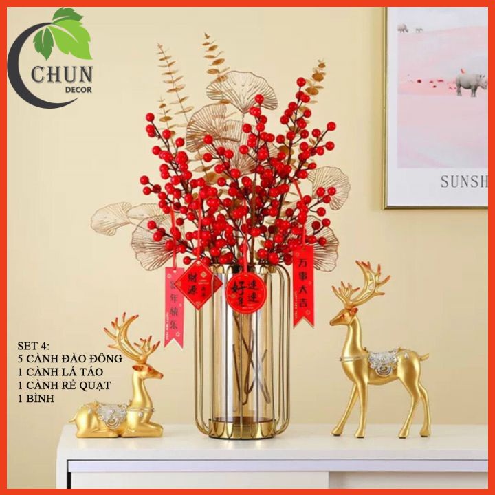 - Cành điểm ánh kim sang trọng, làm nổi bật sắc đỏ đào đông
