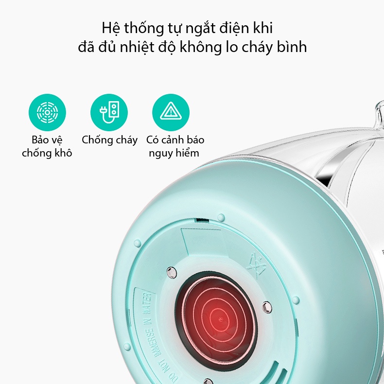 - Thiết kế hiện đại, tiện lợi: Thân bình bằng thủy tinh cao cấp có thể chịu được nhiệt độ cao, trong suốt giúp mẹ có thể quan sát được mực nước bên trong dễ dàng. Ngoài ra, bình có thể chứa đến 1200ml nước, đây là lượng nước phù hợp mà cả gia đình có thể sử dụng vừa pha sữa, pha trà, ngũ cốc.