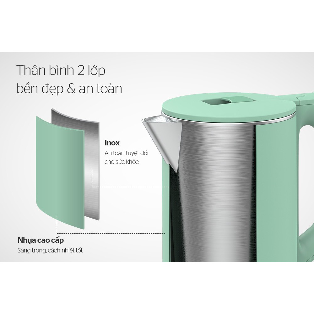 ✔ Dung tích 1.7 lít - công suất 1.500W đun nhanh✔ Thân ấm 2 lớp chống bỏng: Inox – Nhựa PP