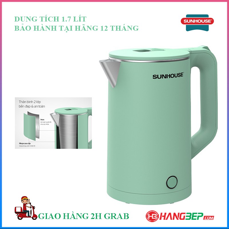 Bình đun nước siêu tốc inox 2 lớp 1.7 lít Sunhouse SHD1350 (new model 6.2021) - - Bảo hành chính hãng 12 tháng toàn quốc