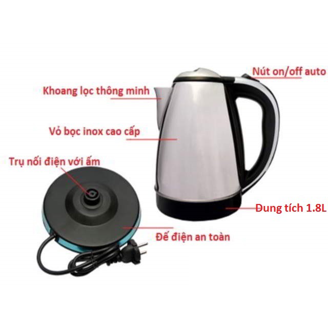 Ấm đun siêu tốc Electric Kettle 1.8 lít an toàn, tiện dụng, đun nước cực nhanh. Vỏ sản phẩm làm bằng inox sáng bóng, bền đẹp, không bị gỉ sét. Đế rời bằng nhựa chắc chắn, cách nhiệt, cách điện, có thể xoay 360 độ dễ dàng.