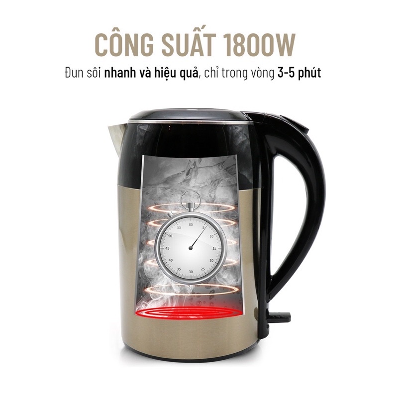 Thiết kế thân bình 2 lớp, gồm lớp ngoài là nhựa cao cấp chịu nhiệt tốt, độ sáng bóng đẹp và sang trọng, bên trong là inox 304 liền khối, không có mối nối như nhưng ấm siêu tốc thông thường. Với lớp inox 304 liền khối này, ấm sẽ bền, không gây rò rỉ, không gỉ, không gây độc hại cho người tiêu dùng, không làm sản sinh chất độc hại vào nước khi đun ở nhiệt độ cao, bền lâu khi sử dụng, nhờ đó đảm bảo sức khỏe cho người dùng