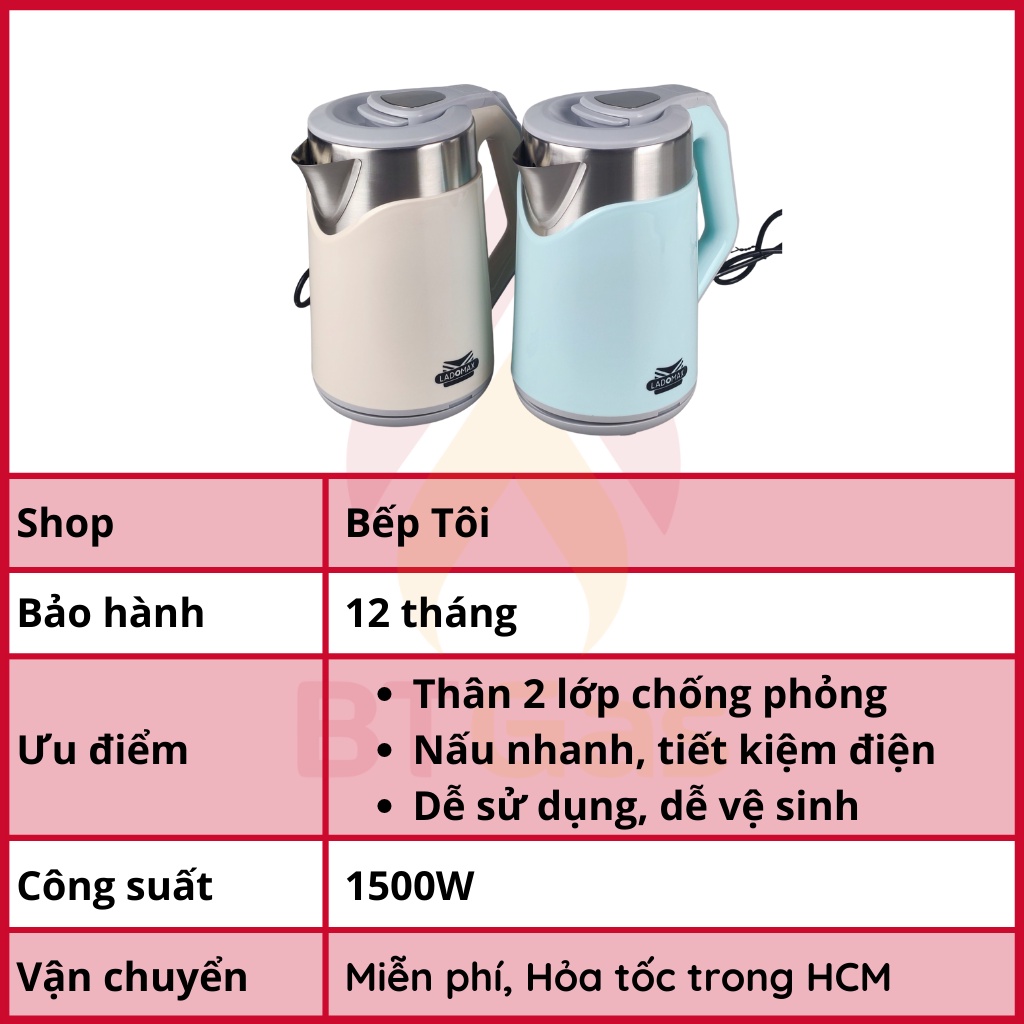 Thiết Bị Điện Gia Dụng > Đồ gia dụng nhà bếp > Ấm đun siêu tốc || Bình đun siêu tốc, ấm siêu tốc Inox 2 lớp chống phỏng đun nước siêu nhanh Ladomax HA-886 2.3LCòn hàng