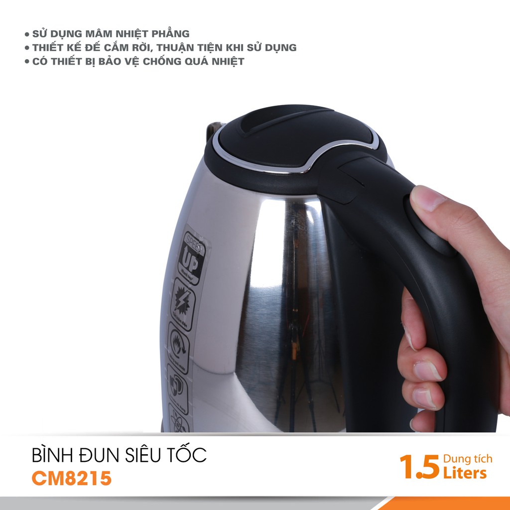 - Bình đun siêu tốc CM8215 được thiết kế âm nhiệt rời, có khe cài dây điện dưới đáy, dễ sử dụng và vệ sinh, chống cháy. Bình có lớp inox không truyền nhiệt, chống bỏng nóng trong quá trình sử dụng hay di chuyển, bảo đảm an toàn cho người sử dụng.
