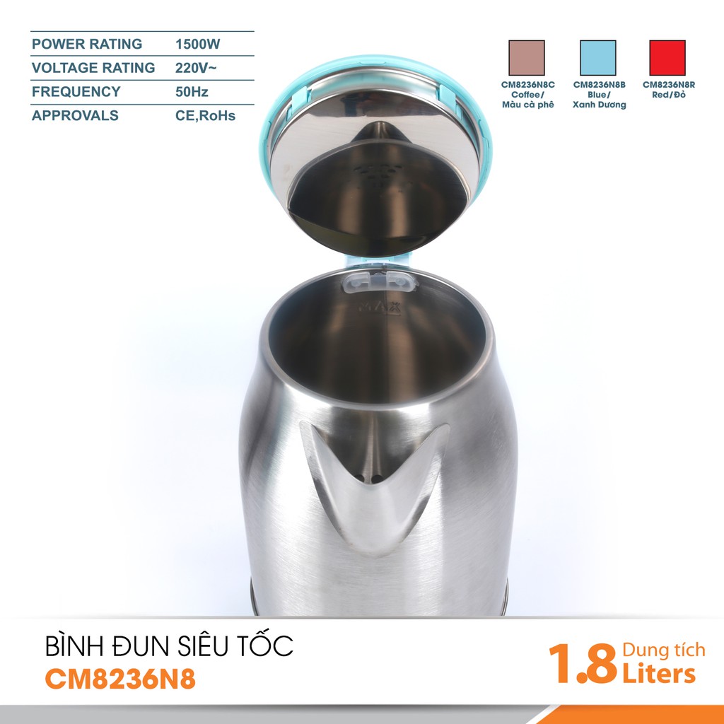 - Các bộ phận bình đun siêu tốc CM8236N8 có thiết bị bảo vệ chống quá tải, tự động nhảy công tắc ngắt điện chính xác, tránh các tình trạng chập điện xảy ra gây nguy hiểm cho người dùng.