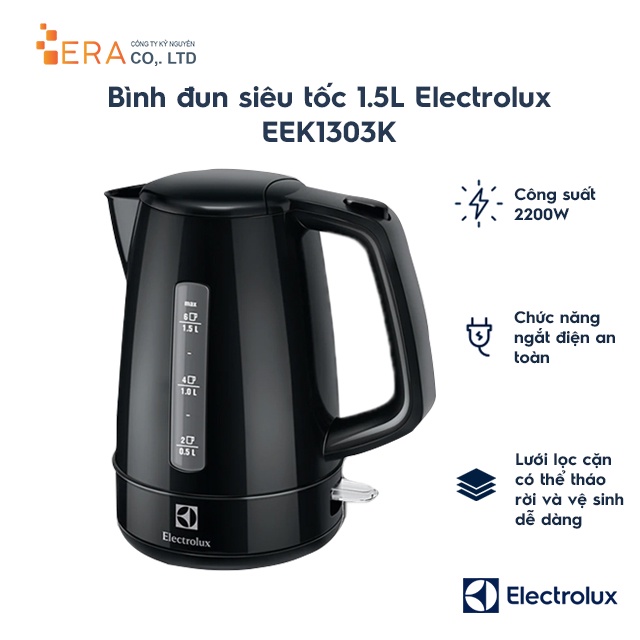 MÔ TẢ SẢN PHẨM:Bình đun siêu tốc Electrolux 1.5 lít EEK1303K có kiểu dáng nhỏ gọn, kết hợp cùng tông đen sang trọng vừa tôn lên sự hiện đại, vừa tiết kiệm diện tích sử dụng cho gian bếp.
