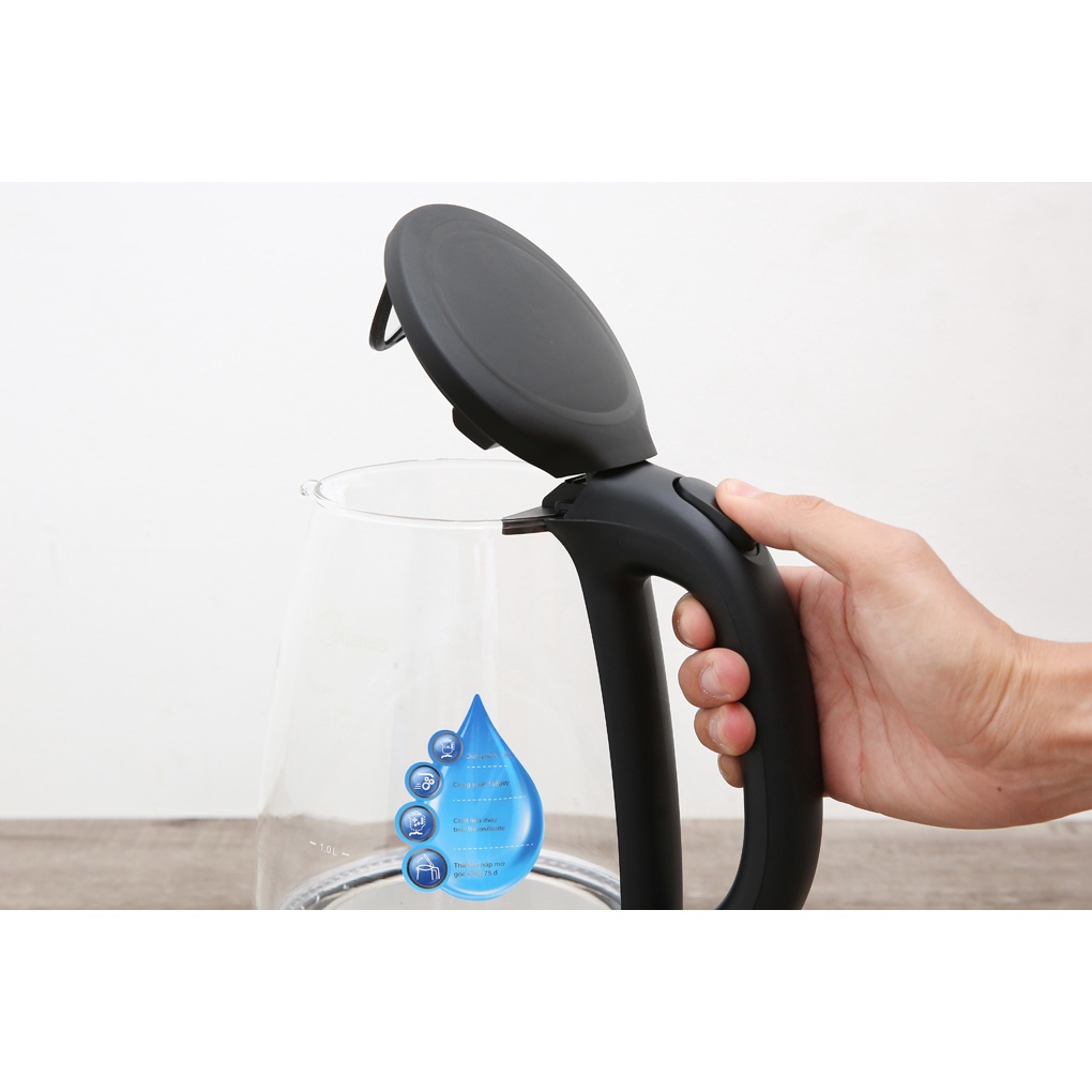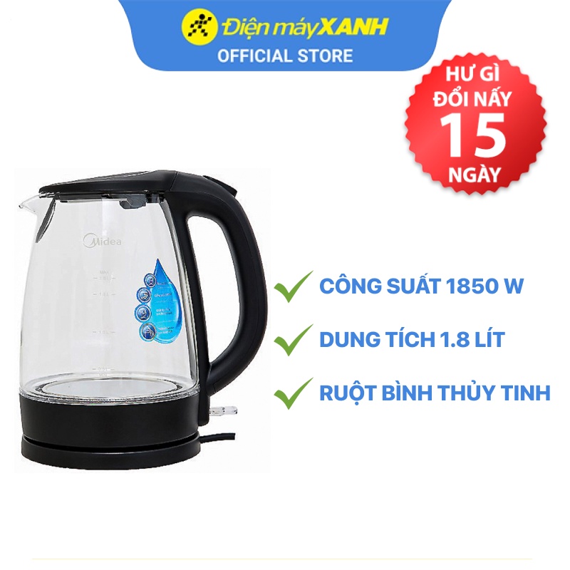 ● Bình đun siêu tốc Midea có vỏ bình bằng thủy tinh chịu nhiệt cao cấp, sang trọng, dung tích 1.8 lít đáp ứng nhu cầu nước nóng cho gia đình có từ 3 - 4 thành viênChất liệu thủy tinh trong suốt không tỳ vết, kháng vỡ, nứt, an toàn cho sức khỏe, dễ vệ sinh.