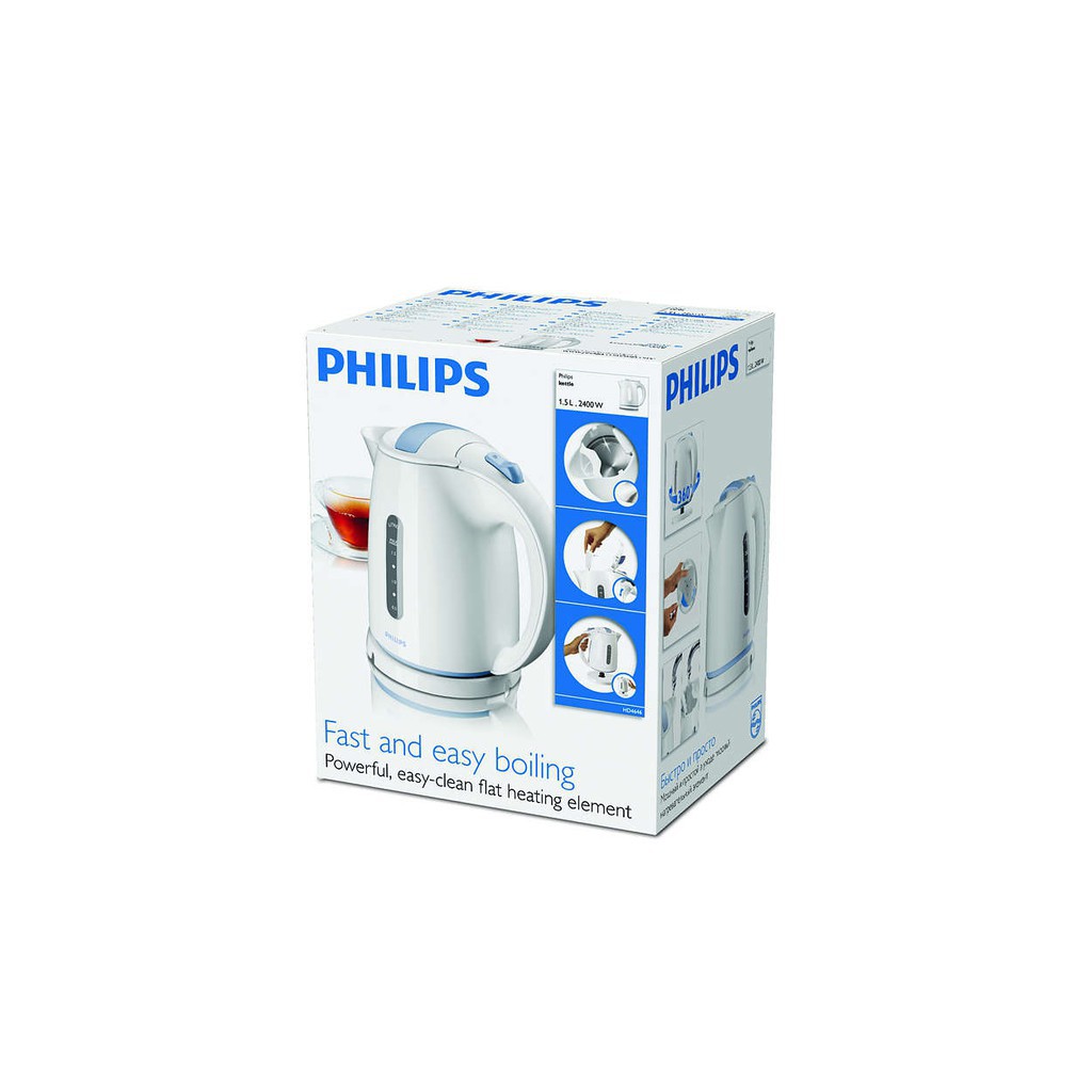 Bình đun siêu tốc Philips HD4646 được nhập khẩu nguyên chiếc từ Ba Lan với dung tích 1.5 lít và công suất 2400W phù hợp với mọi đối tượng khách hàng. Philips HD4646 với chế độ bảo hành lên đến 24 tháng giúp bạn hoàn toàn tự tin để trang bị sản phẩm này cho gia đình mình.Bình đun nước siêu tốc Philips HD4646 có bộ phận làm nóng bằng inox phẳng nên làm nóng nước đặc biệt nhanh và dễ chùi rửa. Bình đun còn được trang bị bộ lọc chống vôi hóa để nước đảm bảo độ tinh khiết, bình đun của bạn cũng sẽ luôn sạch, dễ vệ sinh cũng như sử dụng năng lượng hiệu quả.
