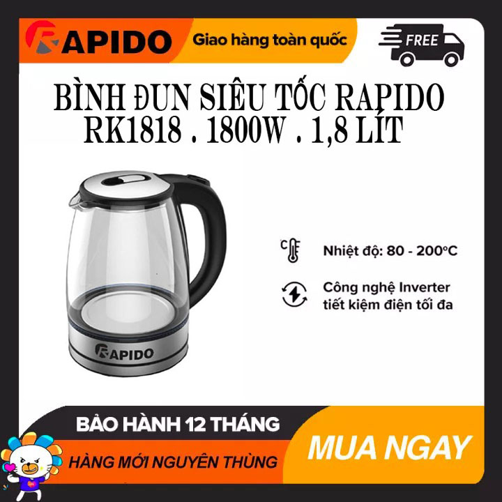 Thiết Bị Điện Gia Dụng > Đồ gia dụng nhà bếp > Ấm đun siêu tốc || [Mã ELHADEV giảm 4% đơn 300K] Bình đun siêu tốc Rapido RK1818, 1800 W, 1,8 lit.Bảo Hành Chính Hãng 06 tháng [SALE LỚN]Còn hàng