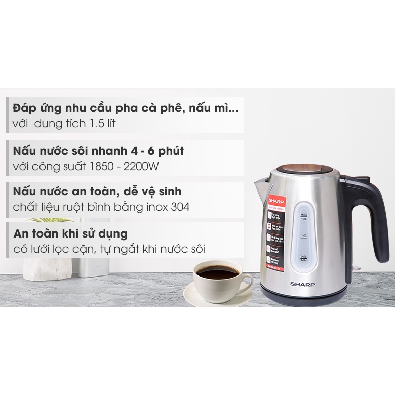 ✅ Bình đun siêu tốc Sharp kiểu dáng hiện đại, gọn đẹp, dung tích 1.5 lít phù hợp sử dụng tại gia đình, văn phòng cho nhu cầu nước nóng pha trà, sữa, nấu mì…