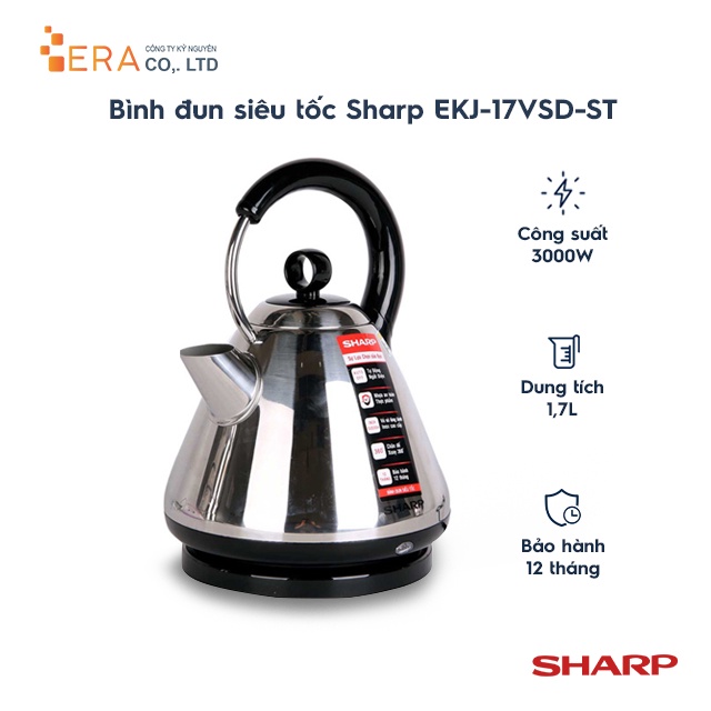 - Bình đun siêu tốc Sharp EKJ-17VSD-ST 1.7L được thiết kế hiện đại, thang đo thể hiện mực nước bên ngoài bình thuận tiện quan sát thích hợp cho mọi không gian bếp. Thiết kế nút công tắc và mở nắp ngay phía trên rất tiện lợi để thao tác sử dụng.