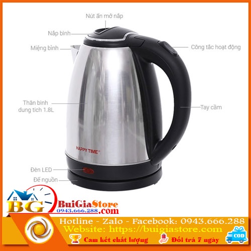 Ấm siêu tốc,bình siêu tốc HAPPYTIME HTD1081 nấu siêu nhanh,không hoen đế,bảo hành 06 tháng🌱Đặc điểm của ấm siêu tốc HTD1081