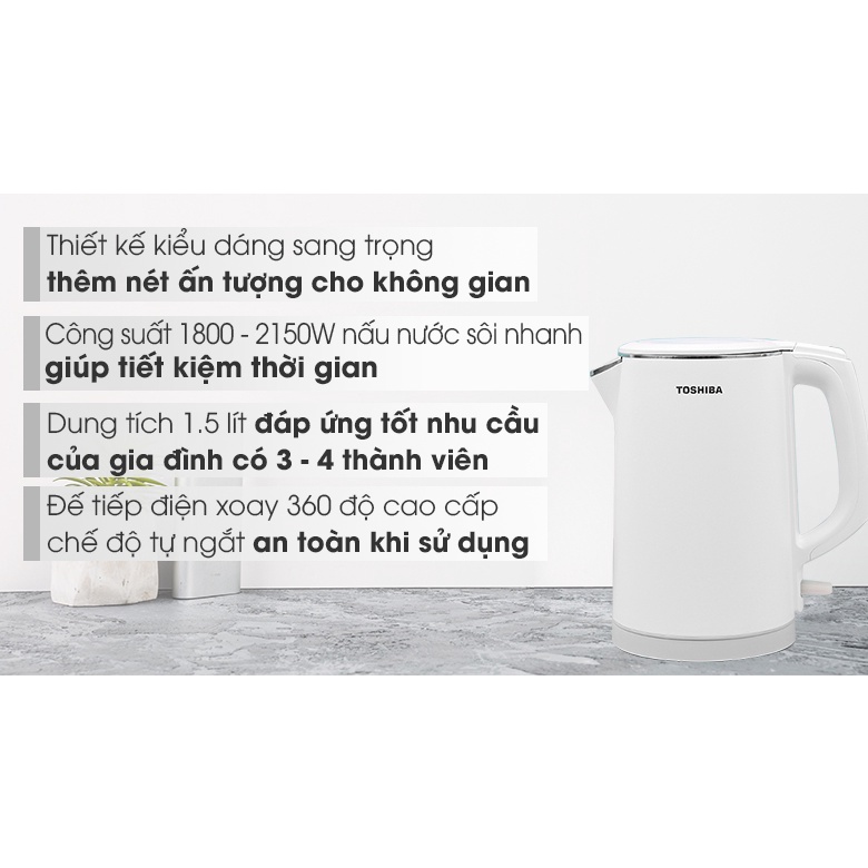 Bình đun siêu tốc Toshiba thiết kế đơn giản, màu trắng tươi sáng cho không gian bếp thêm hiện đại, tinh tế