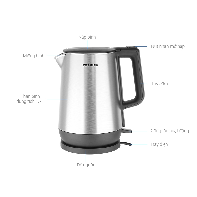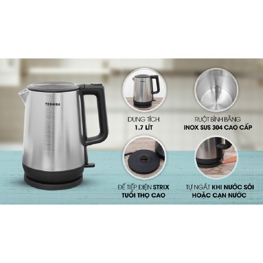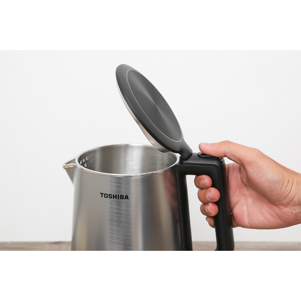 Bình đun siêu tốc Toshiba màu inox sáng bóng, kiểu dáng sang trọng, dung tích 1.7 lít sử dụng thuận tiện tại gia đình, văn phòng nhỏ...