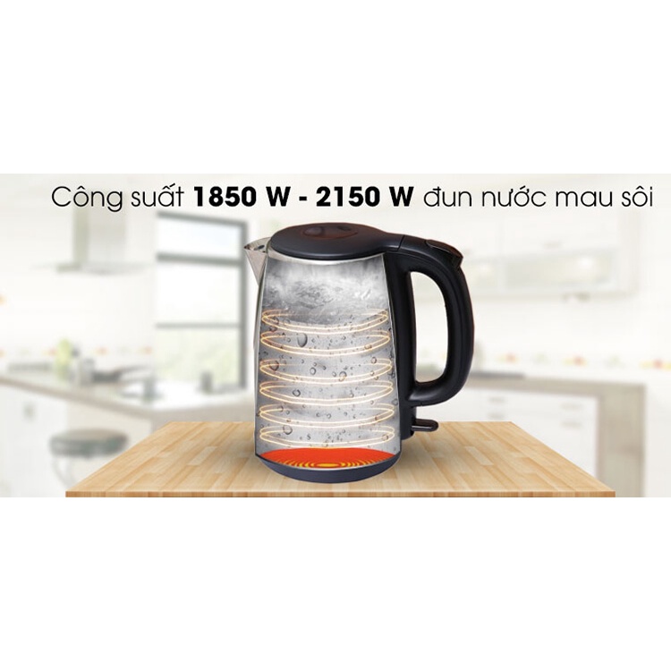 Công suất của ấm là 2150W giúp đun nước nhanh sôi. Với tay cầm bằng nhựa cao cấp cách nhiệt và công tắc gạt bật tắt dưới thân tay cầm cũng mang lại sự tiện dụng khi hoạt động. Ngoài ra ấm còn có tính năng tự động ngắt điện khi sôi và khi ấm cạn nước, an toàn hơn khi sử dụng. Dây điện của ấm tách rời, giúp bạn đỡ vướng víu khi lấy nước hoặc rót nước.