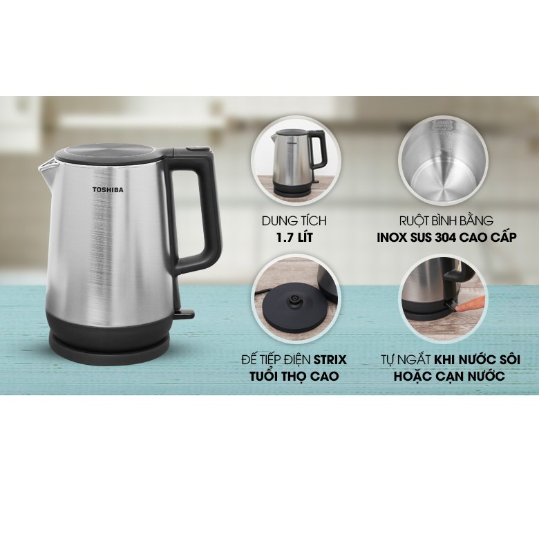 Bình đun siêu tốc Toshiba màu inox sáng bóng, kiểu dáng sang trọng,1.7 lít sử dụng thuận tiện tại gia đình, văn phòng nhỏ...