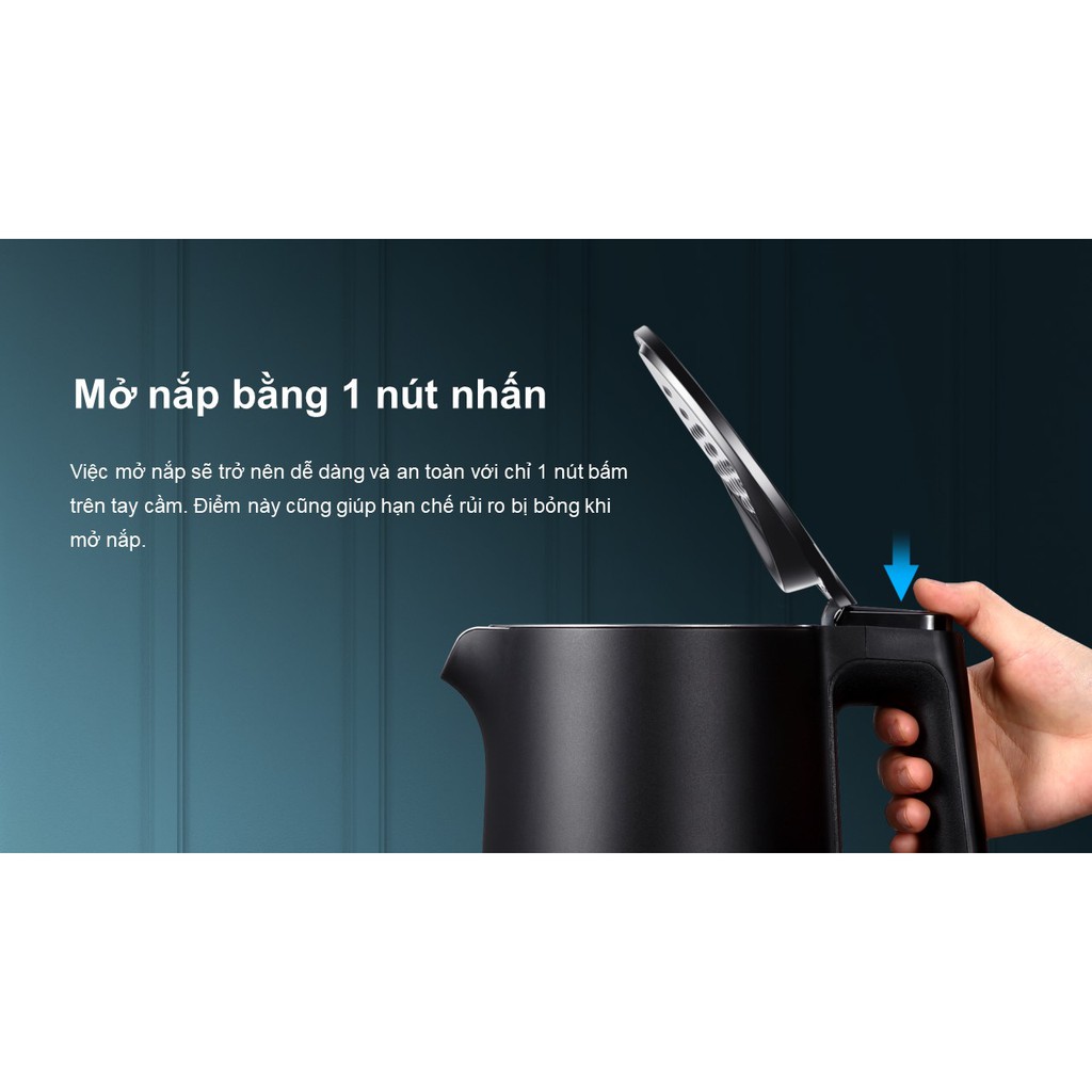 Bình đun siêu tốc có dung tích 1.5 lít, công suất 1800 - 2150 W.Vỏ bằng nhựa PP, ruột bằng inox 304 đúc nguyên khối bền bỉ.