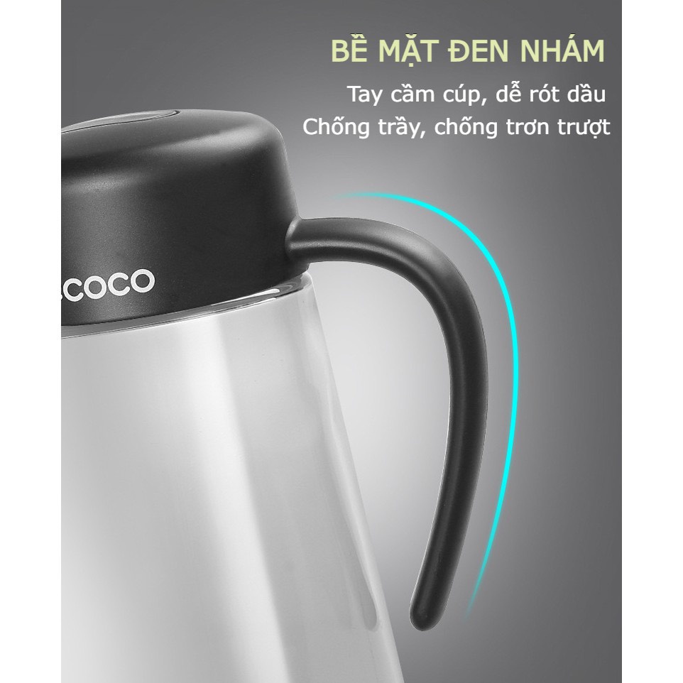 - Tay cầm cúp, dễ thao tác nghiêng bình. Vòi rót bằng thép không gỉ Inox 304 không hoen rỉ, không đóng cặn