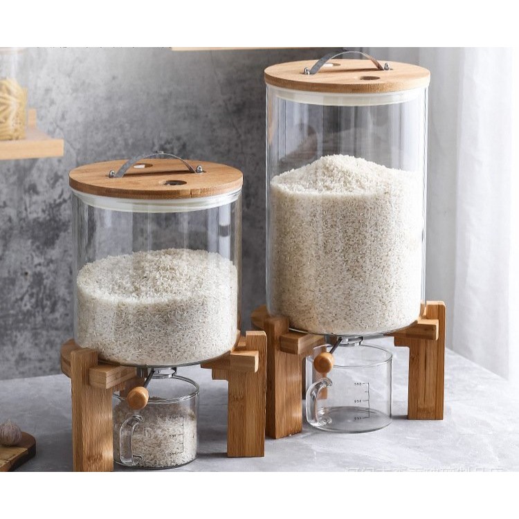 Bình đựng gạo kèm cốc đong ☘𝘾𝘼𝙊 𝘾𝘼̂́𝙋☘ Bình thủy tinh đựng gạo, hạt có chân gỗ, vòi vặn và kèm cốc đong