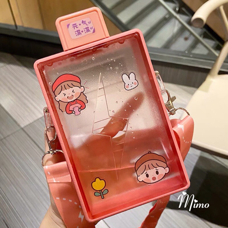Bình đựng nước hình chữ nhật mẫu mới phong cách thể thao nhựa cao cấp dung tích 450ml kèm dây đeo tiện lợi