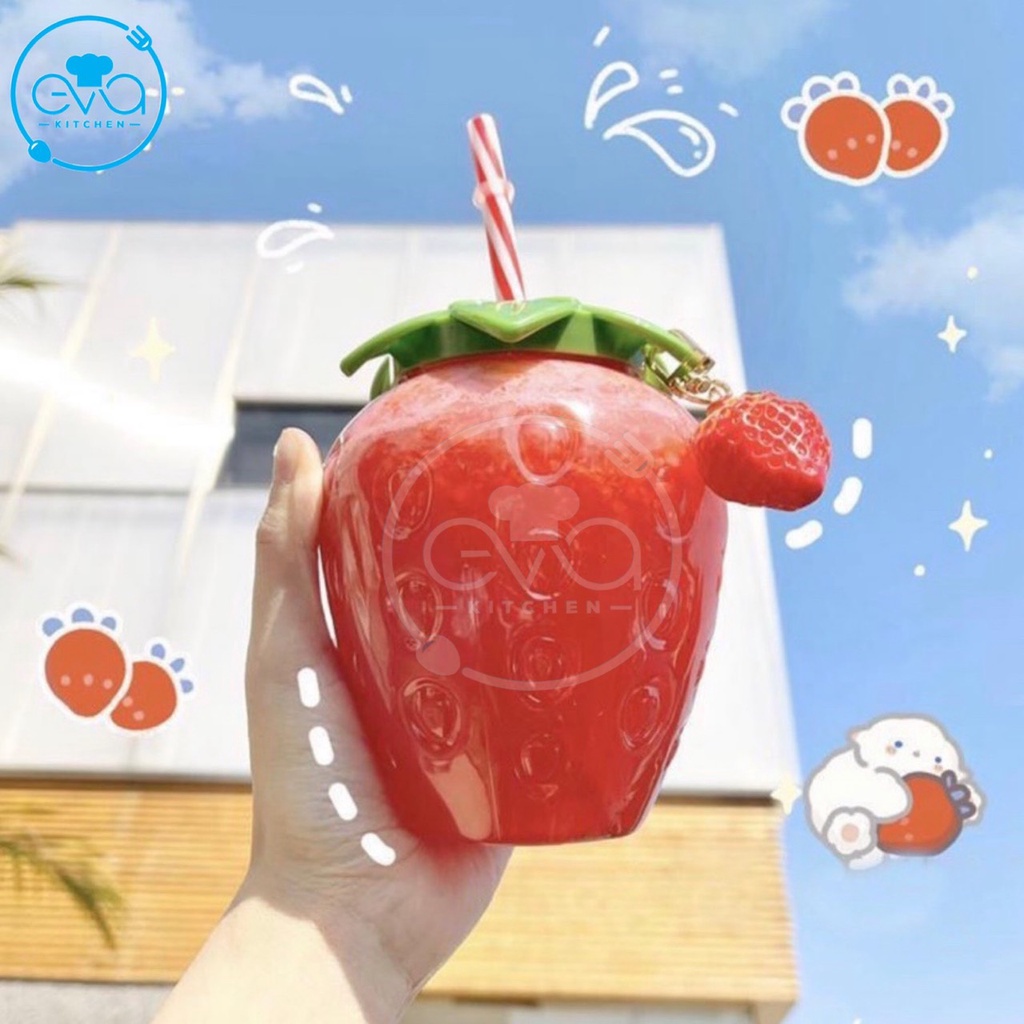 Bình Đựng Nước Nhựa 500ML Kiểu Dáng Quả Dâu Tây Tặng Kèm Ống Hút Và Mốc Khóa Trái Dâu Cute M3488