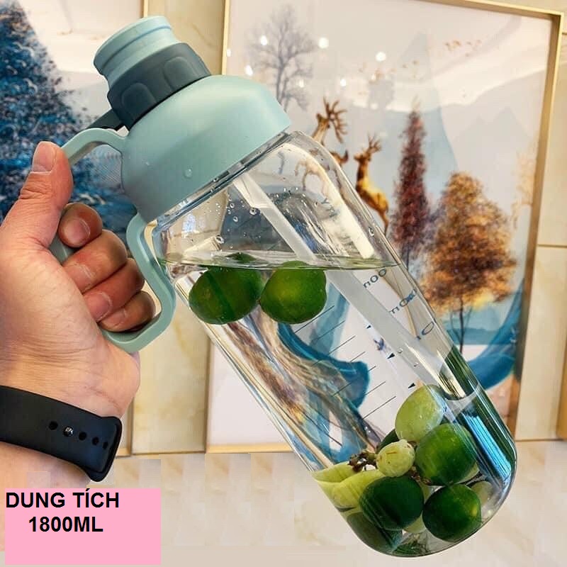 Bình Đựng Nước Nhựa Cỡ Lớn 1800ml Có Vạch Kẻ Chia Dung Tích Và Ống Hút Tiện Dụng