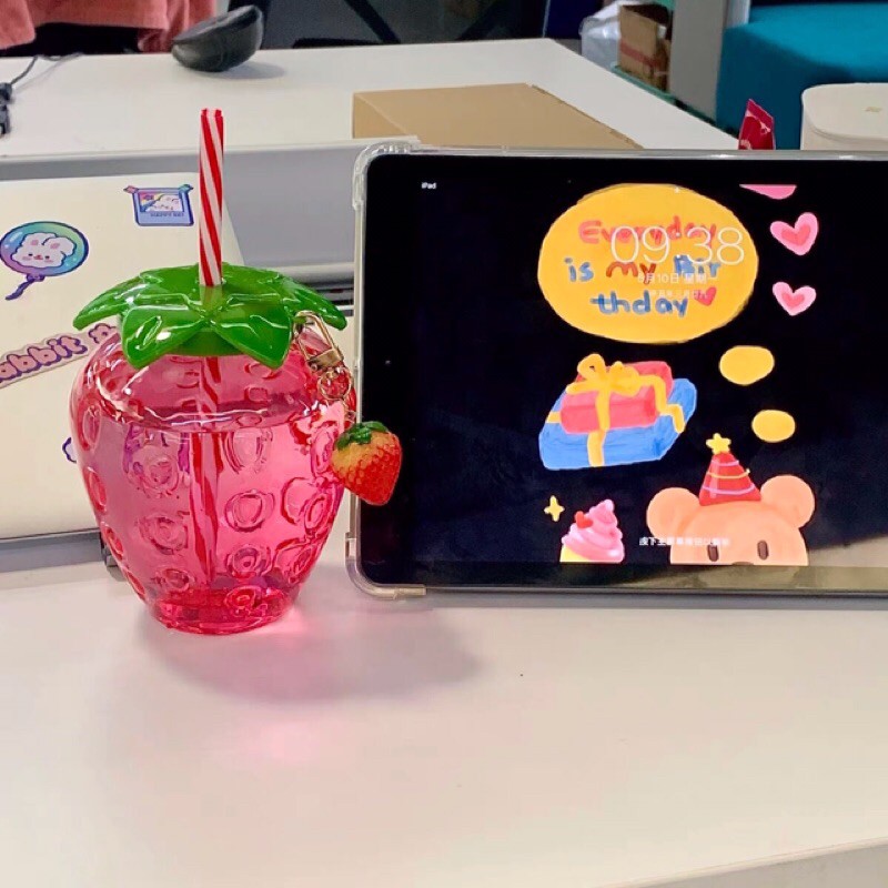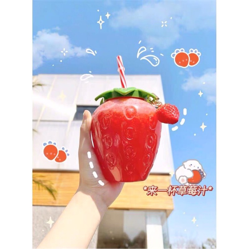 Bình đựng nước quả dâu tây kèm ống hút và móc khoá