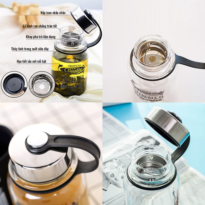 Giới thiệu Bình đựng nước thuỷ tinh cao cấp TROPICAL PARADISE 700ml có ngăn pha trà Inox SUS 304 - Chịu nhiệt - Hoa Văn cao cấp