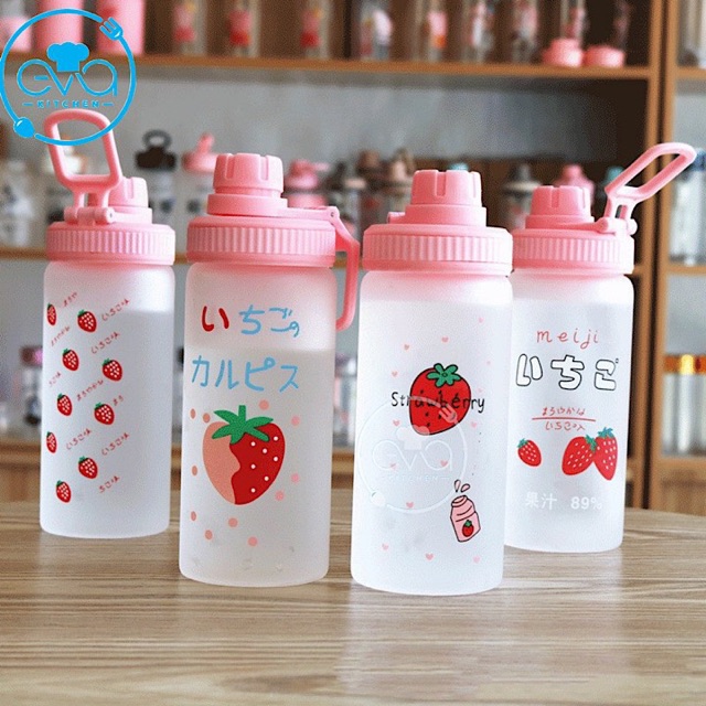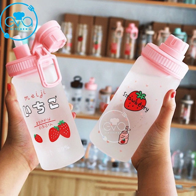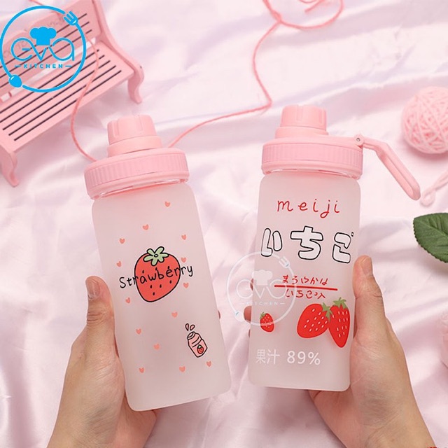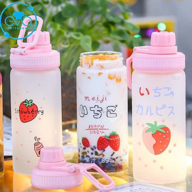 Nhà cửa & Đời sống > Bộ đồ bàn ăn > Bình nước & phụ kiện || Bình Đựng Nước Thuỷ Tinh Mờ Nắp Bật Có Quai Cầm Dâu Tây Strawberry 500 Ml Tặng Kèm Ống Hút Tiện LợiCòn hàng