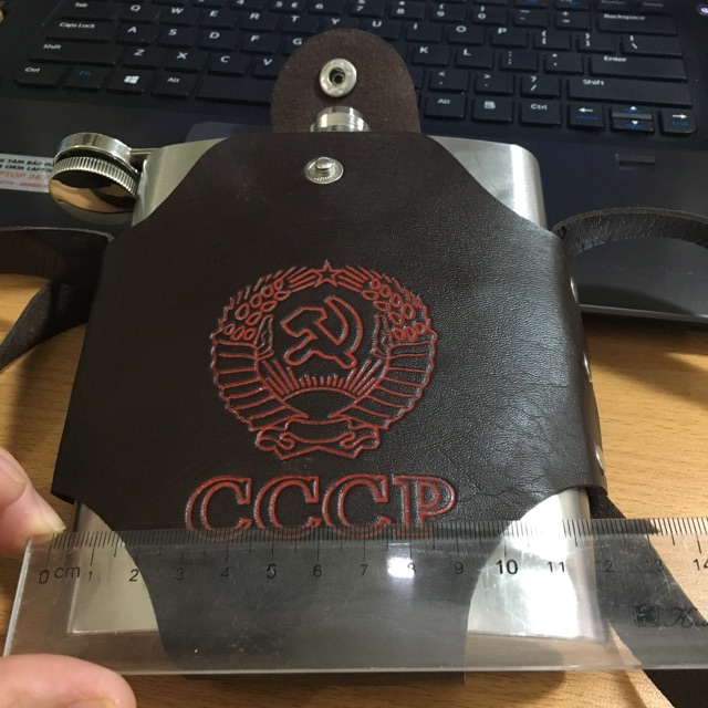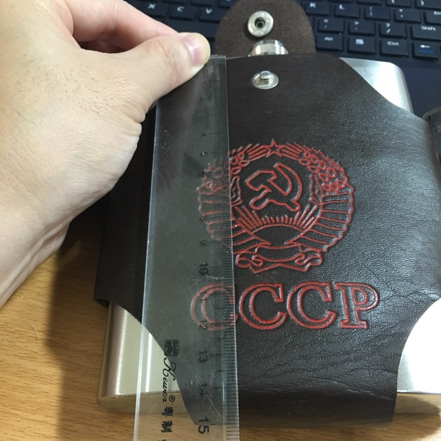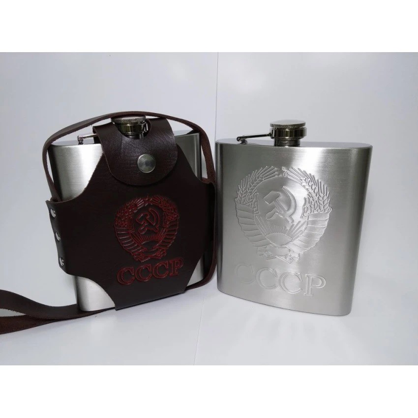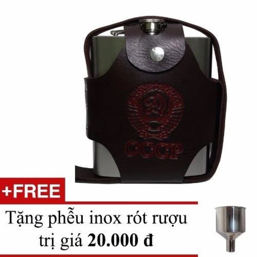 - Bình rượu Inox dập nổi CCCP cao cấp + bao da màu nâu + phễu rót rượu + 1 chén uống rượu