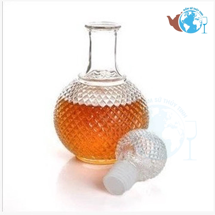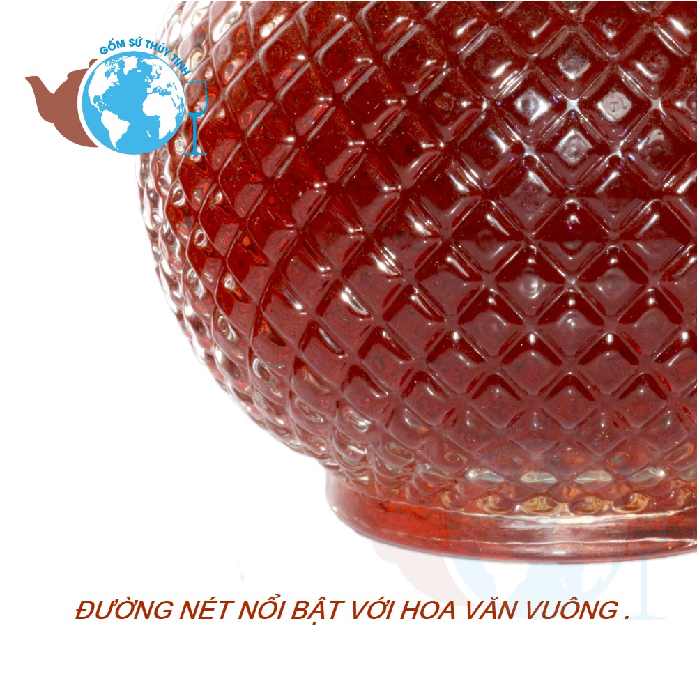 * Bình thủy tinh có độ dày, kiểu dáng hình tháp, phần đáy phình bầu tròn to họa tiết hình vuông lập thể, phần thân tròn nhỏ, nắp bình thủy tinh họa tiết kim cương lập thể, thiết kế kiểu dáng cao cấp tạo hình cao quý sang trọng, thủy tinh trong suốt, nổi bật được bình đựng rượu ngâm bên trong.