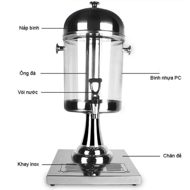 Chân đế được làm bằng inox không gỉ sắt, bình chứa là thủy tinh hoặc nhựa PC cao cấp, ở giữa bình là có ống hình trụ dùng để đặt đá viên vào trong đó, giúp làm lạnh nước trái cây nhưng khi đá tan ra hết thì không tràn ra ngoài.