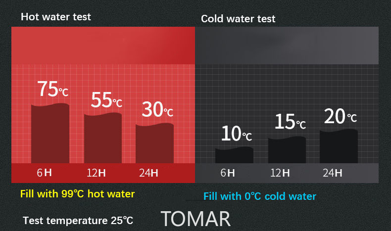 Trả lời: Đổ đầy nước 100°C, 6 giờ sau, nhiệt độ cao hơn 65°C; Nếu cho nước đá vào, 6 giờ sau, nhiệt độ không vượt quá 12°C, dung tích bình càng lớn, hiệu quả giữ nhiệt càng tốt.